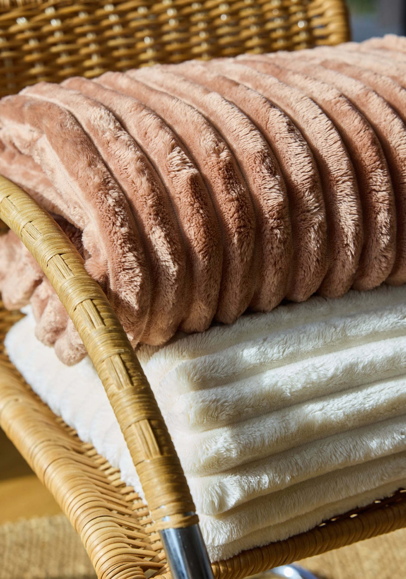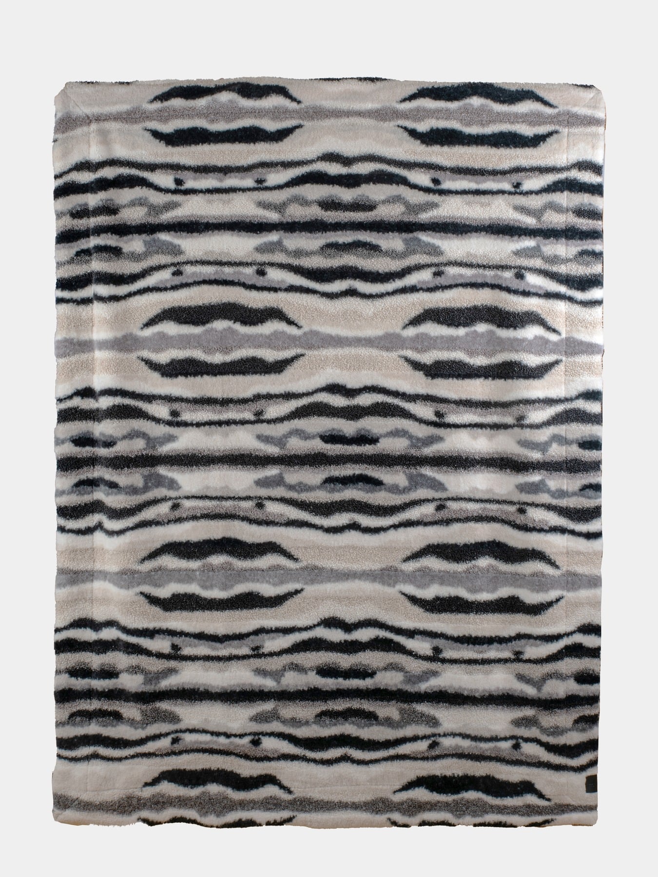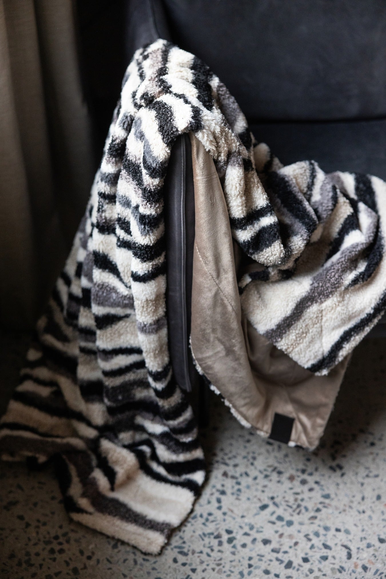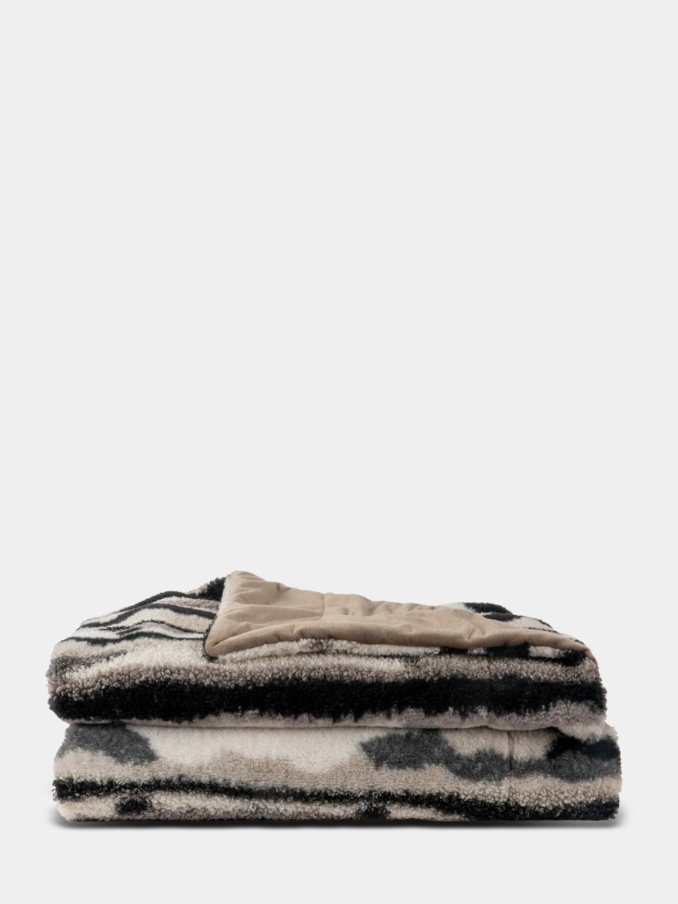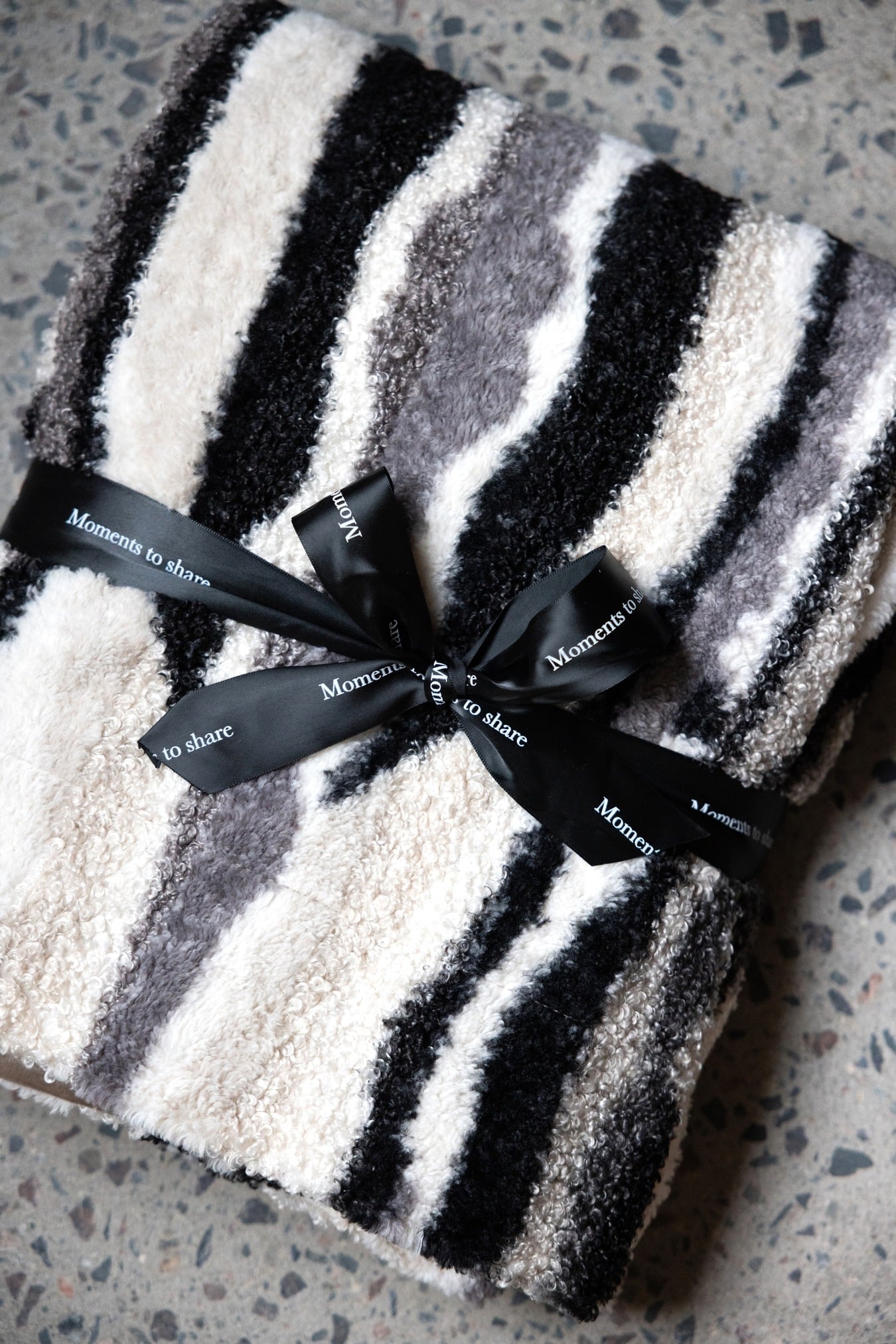 Discover our fantastic and cozy blanket Alba with a versatile print that fits anywhere. Its texture is an exciting blend of teddy and faux fur, providing a cool and luxurious feel. Perfect for both cozy evenings indoors and outdoor use. With a weight of 350/180 gsm, it's made of polyester, offering both warmth and comfort. The colours are mixed in, gray, beige, and black, making it easy to match with your decor. Dimensions: 130x170 cm. Comes with a lovely ribbon.