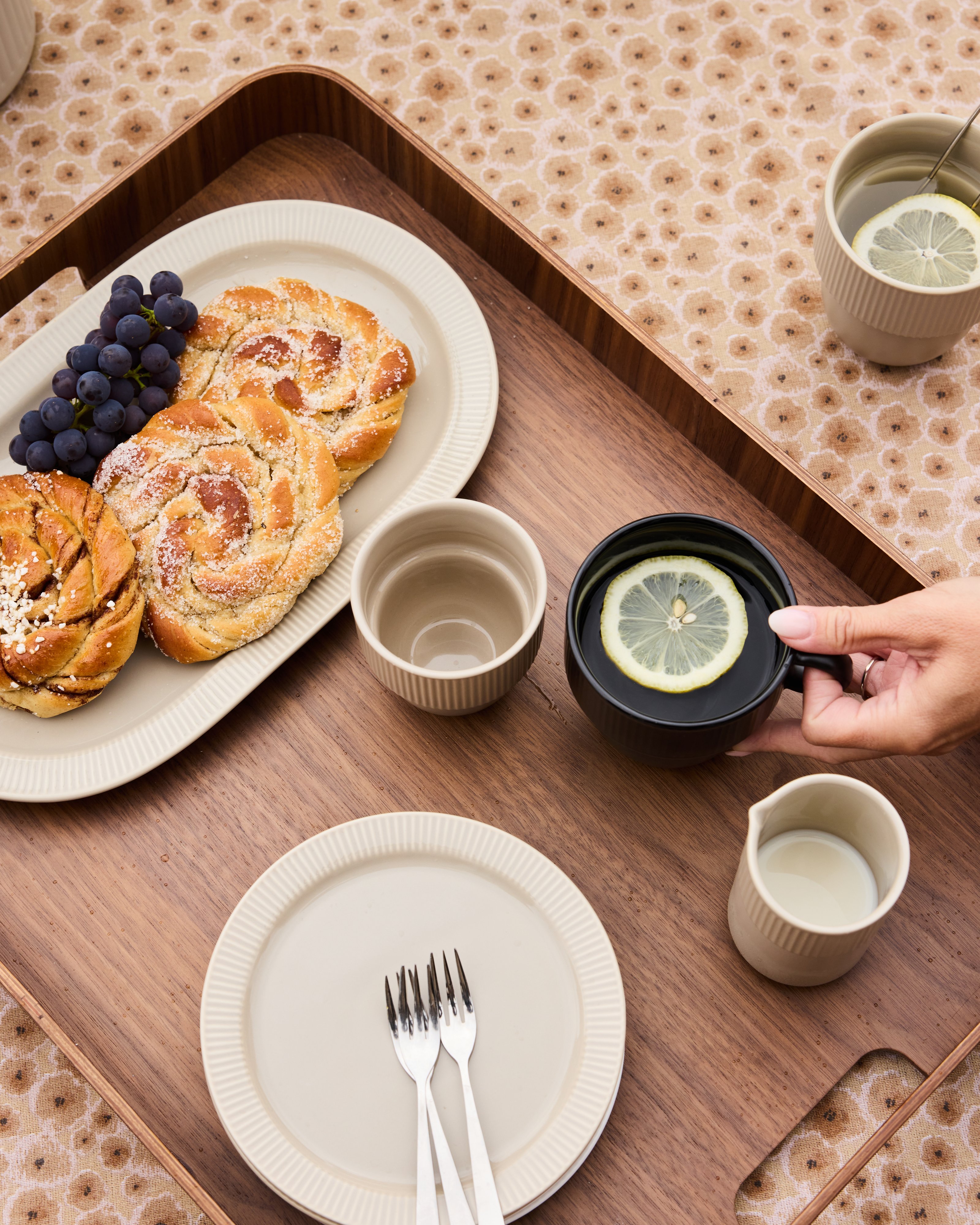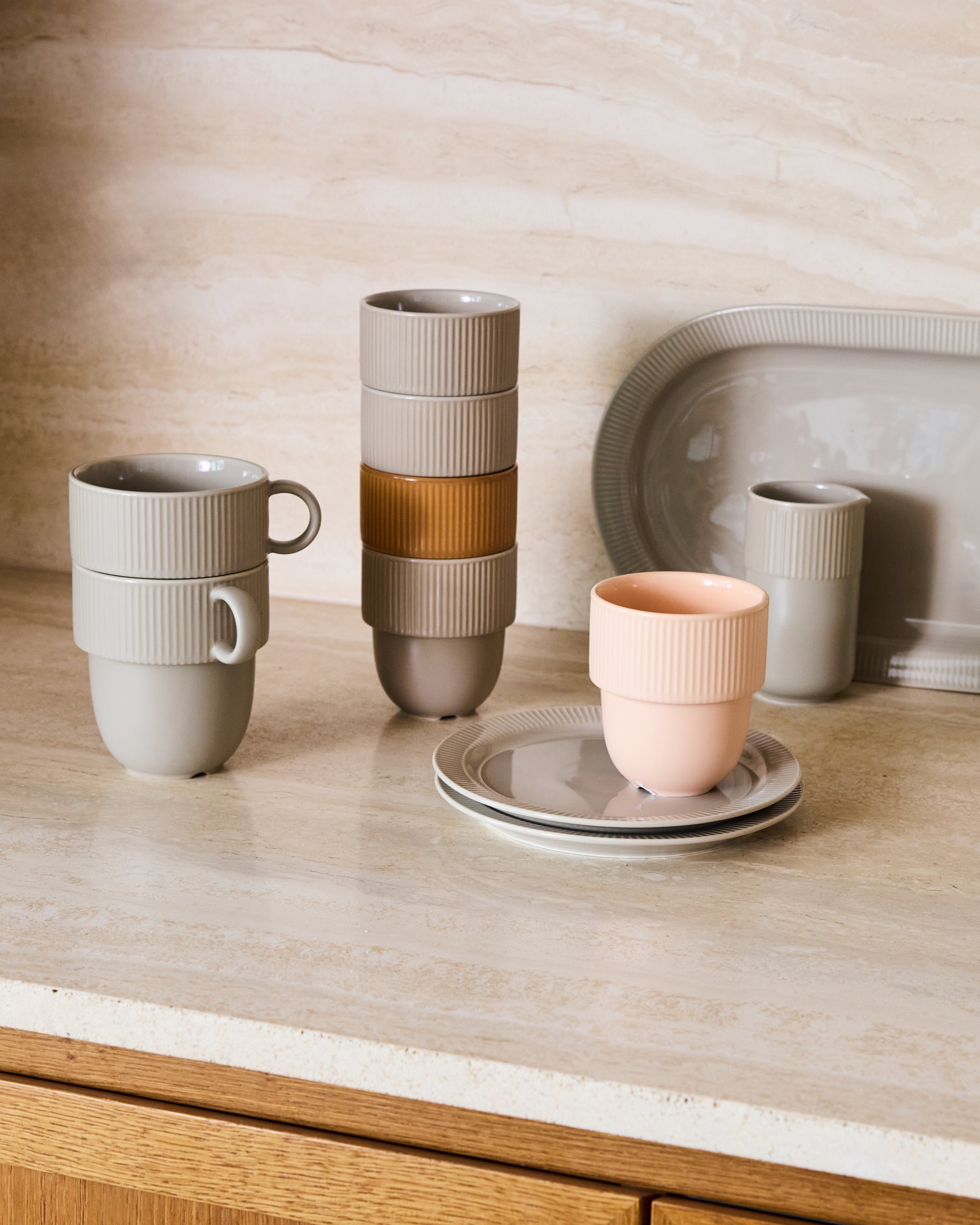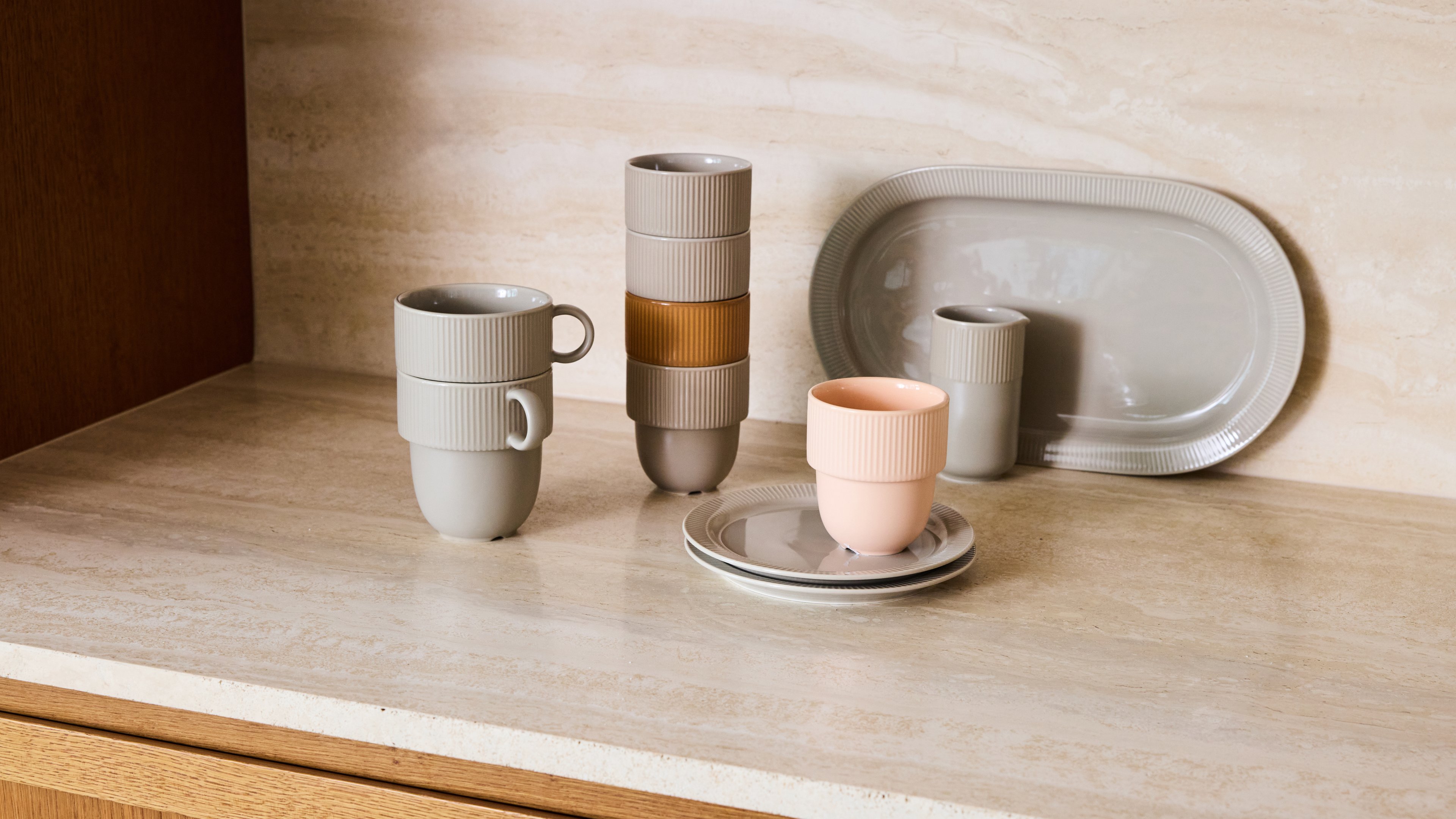 The collection includes cups, side plates, and serving dishes that share the same gentle curves, ribbed details, and carefully considered proportions. Pieces that are easy to use, easy to mix and match, and that work just as well in everyday life as they do over time.