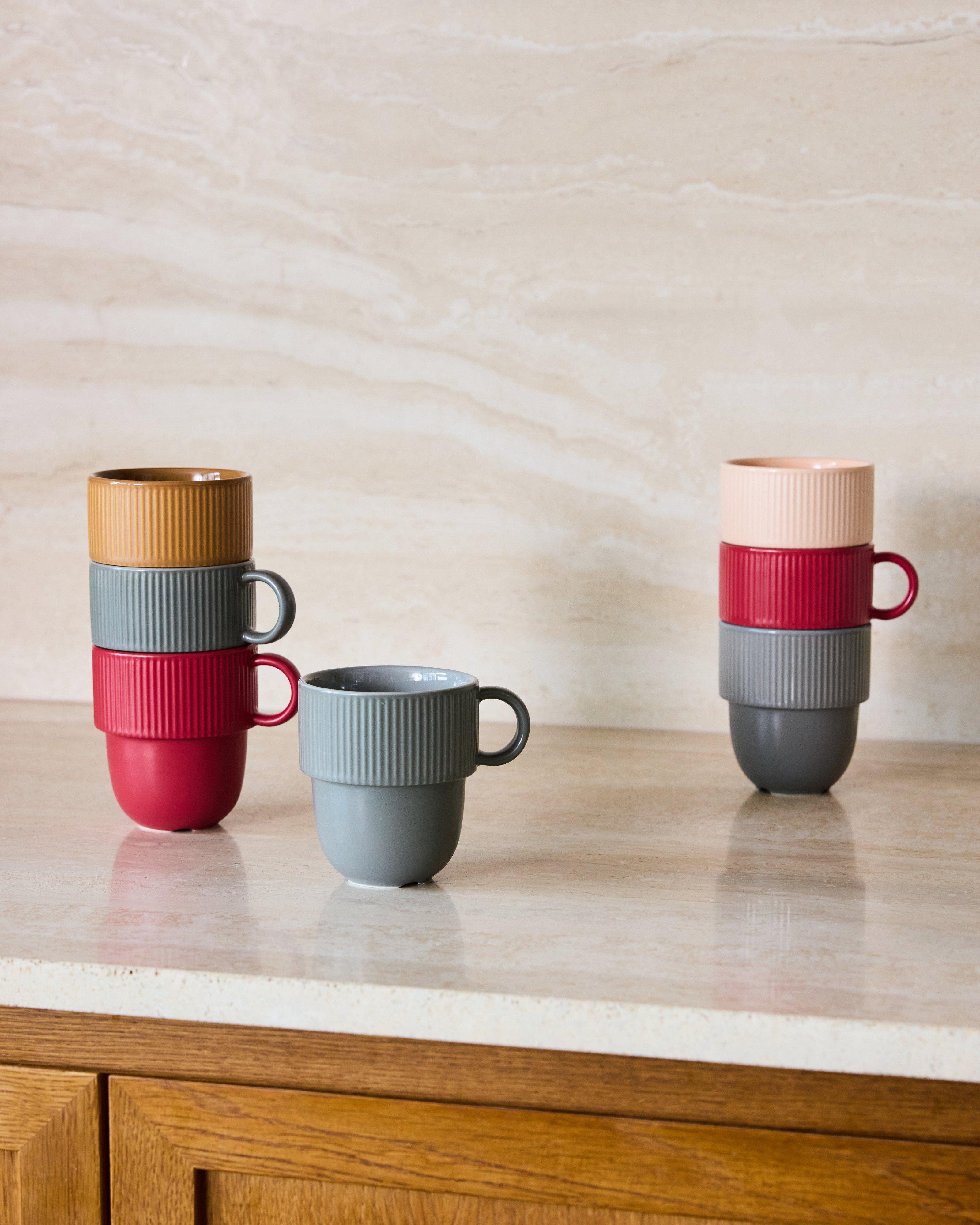 The cup is available with or without a handle. Two styles that can be easily combined and stacked together, depending on the occasion and personal preference. A thoughtful choice that makes the collection flexible, both at home and in the workplace.